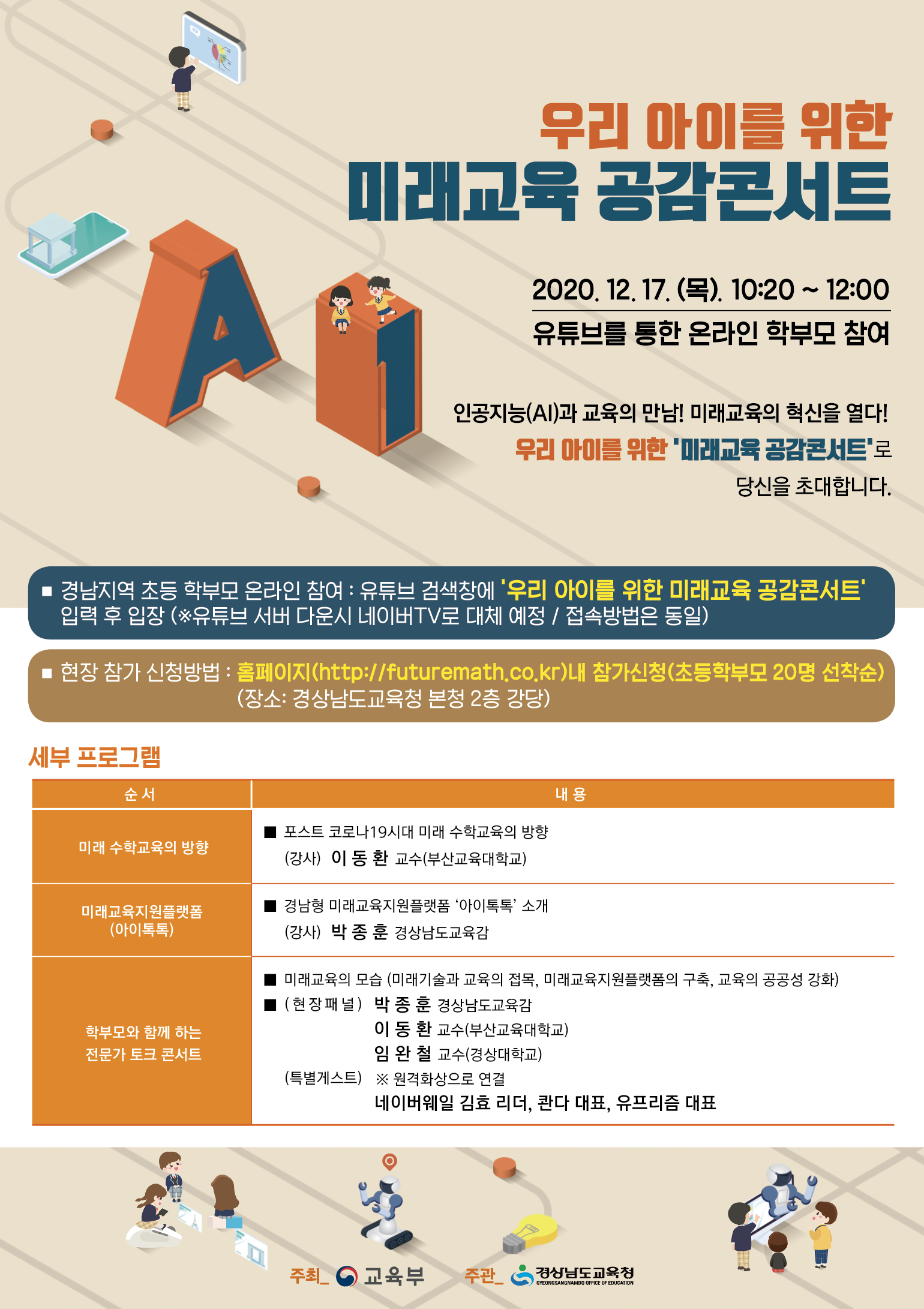 2020년 인공지능(AI)활용 미래교실 수업 혁신(수학중심)을 위하여 우리 아이를 위한 미래교육 공감콘서트 경남지역 행사를 다음과 같이 안내하오니 관심있는 학부모님들의 많은 참여 바랍니다.