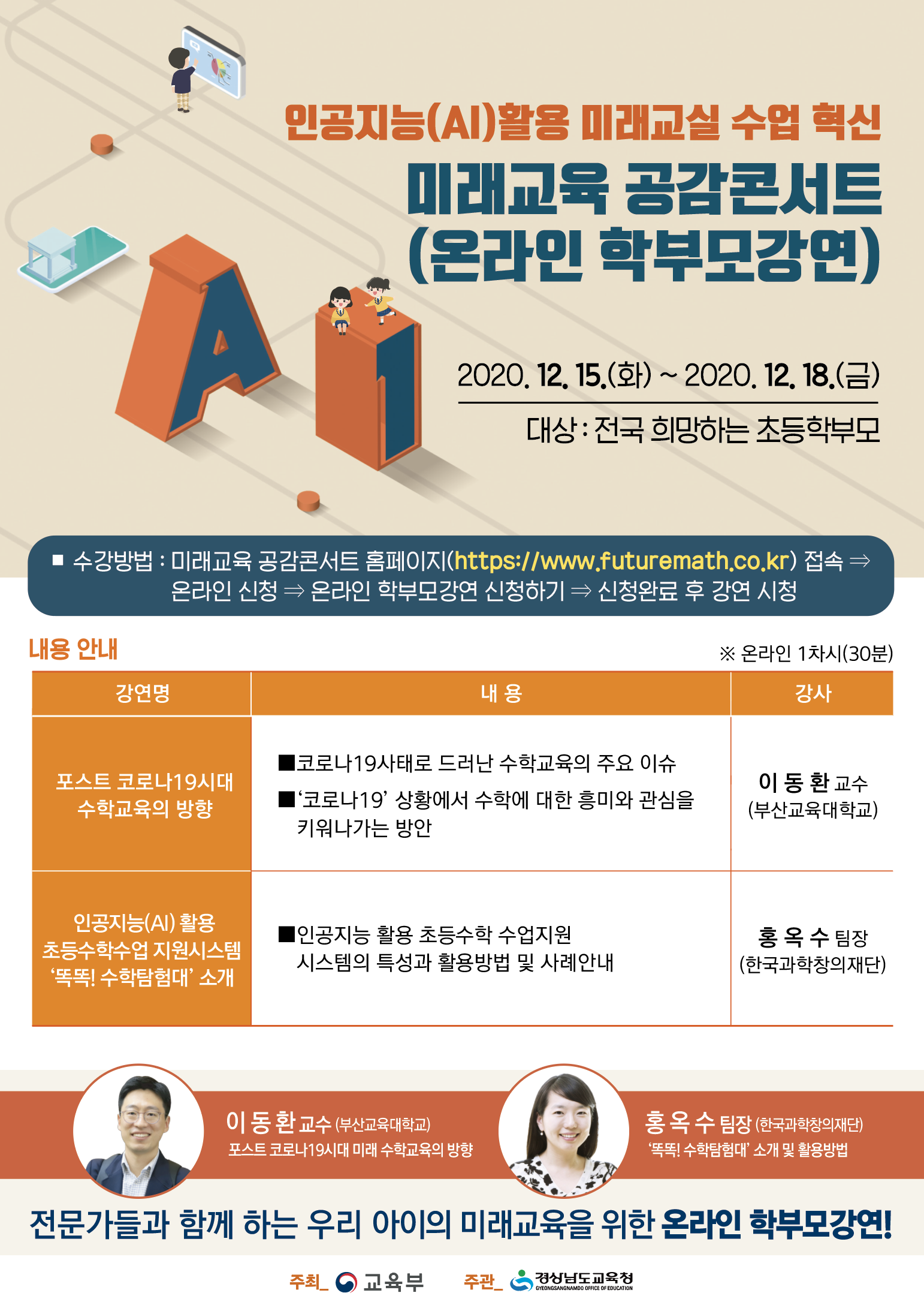 1. 2020년 인공지능(AI)활용 미래교실 수업 혁신(수학중심)을 위한「우리 아이를 위한 미래교육 공감콘서트」온라인 학부모 강연을 다음과 같이 운영하오니, 희망하는 학부모님들의 많은 참여 바랍니다.